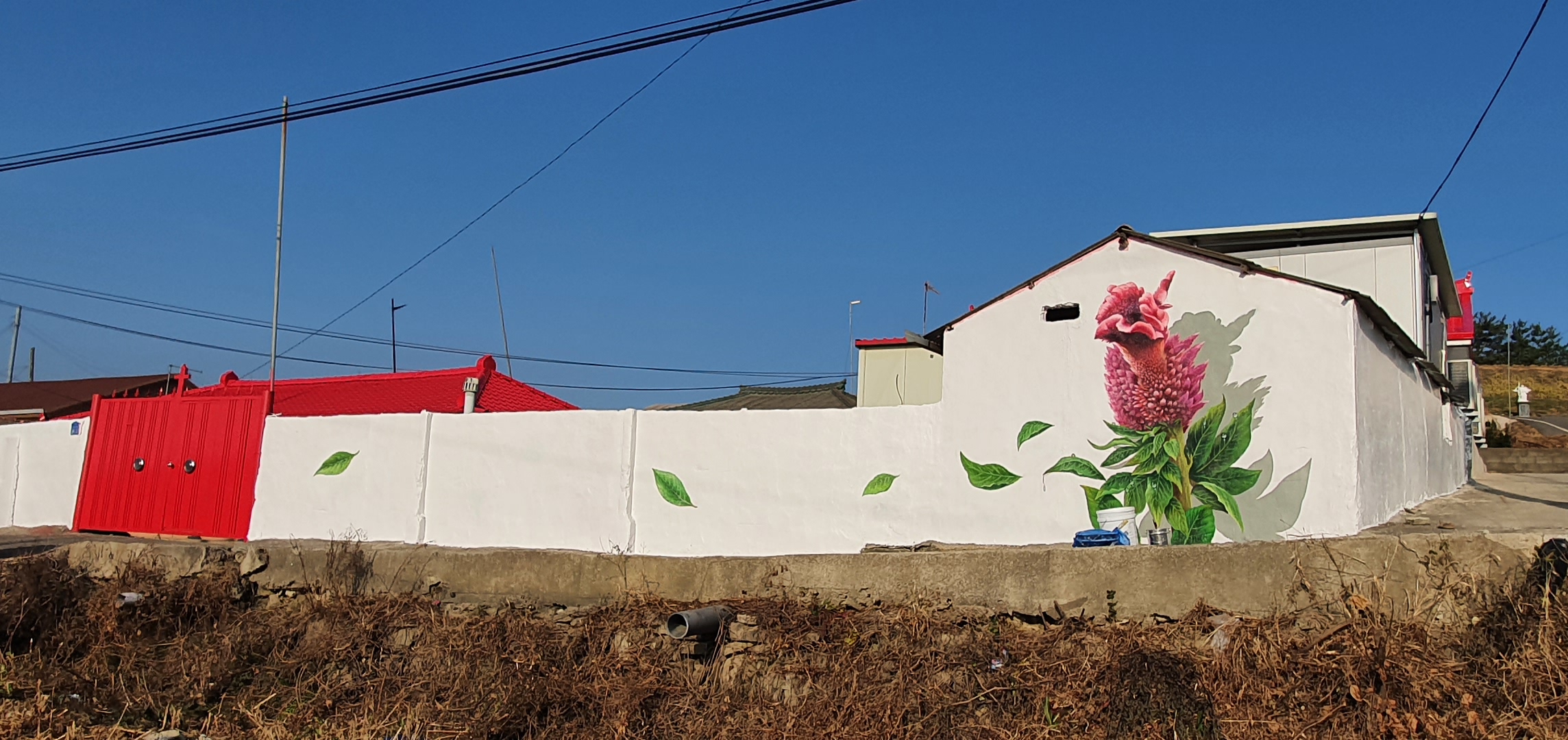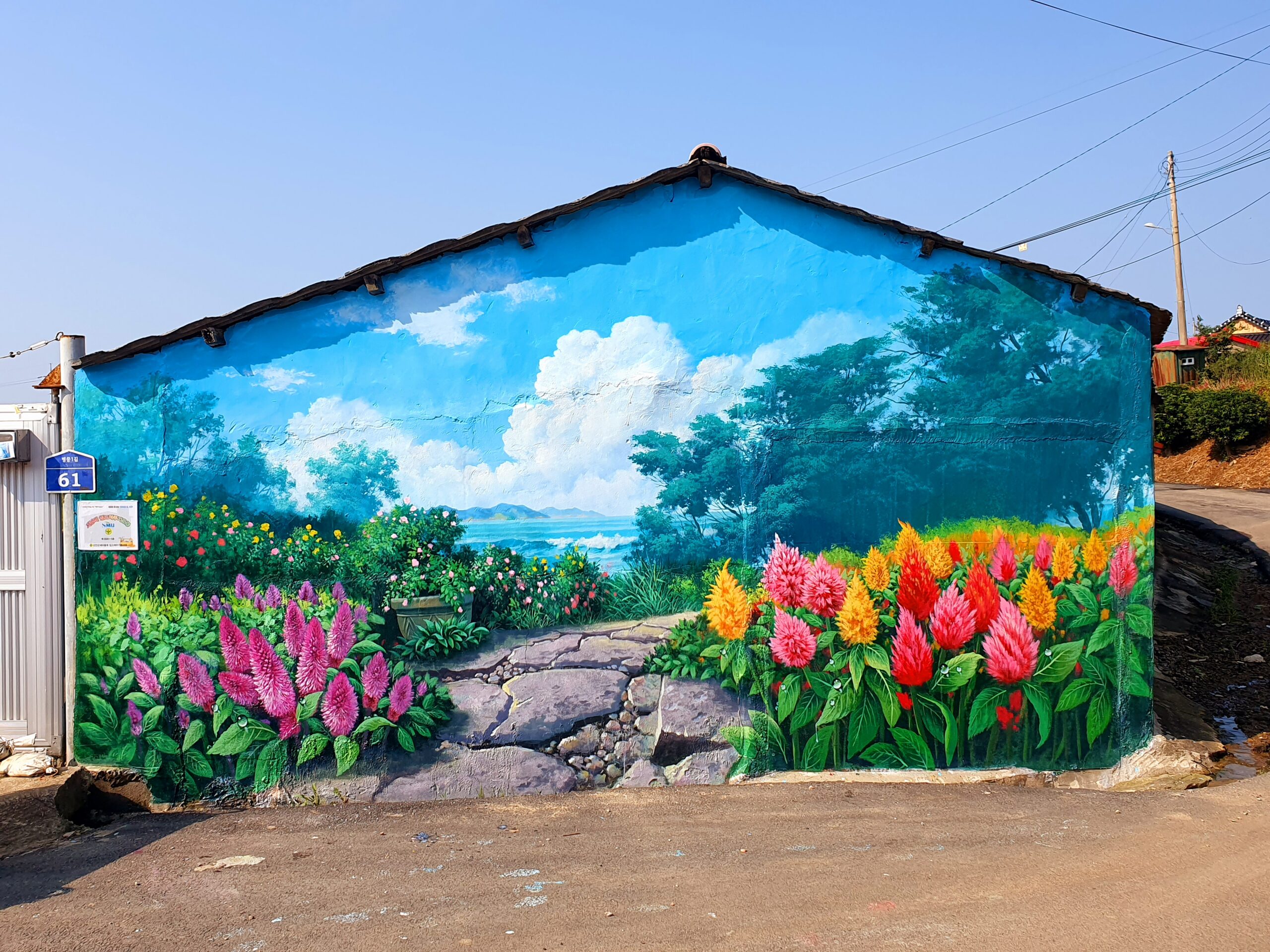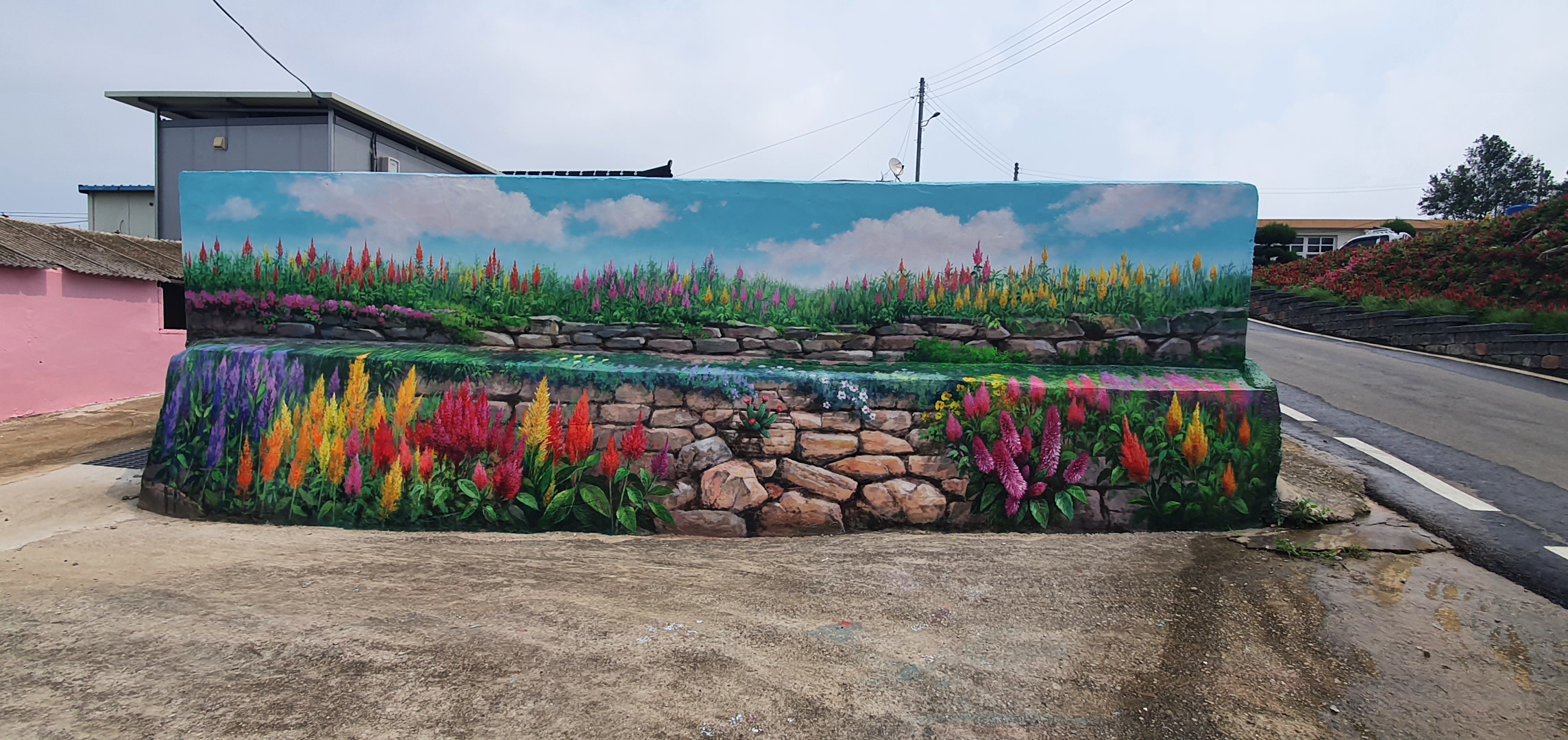 벽화는 맨드라미꽃 특유의 강렬한 색감과 입체적인 형태를 강조해 촬영 시 시선이 자연스럽게 집중되도록 구성되었으며, 방문객이 꽃길을 걷는 듯한 경험을 하며 사진을 남길 수 있도록 동선과 배경을 고려해 배치되었습니다.