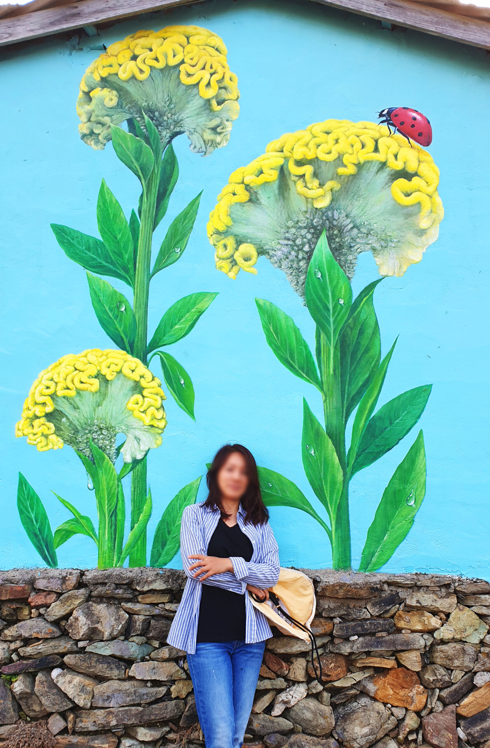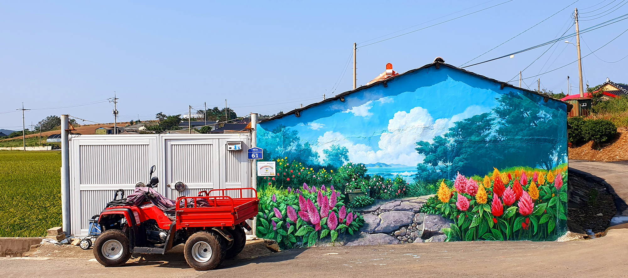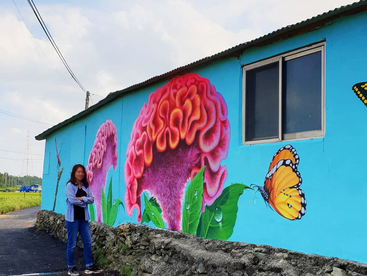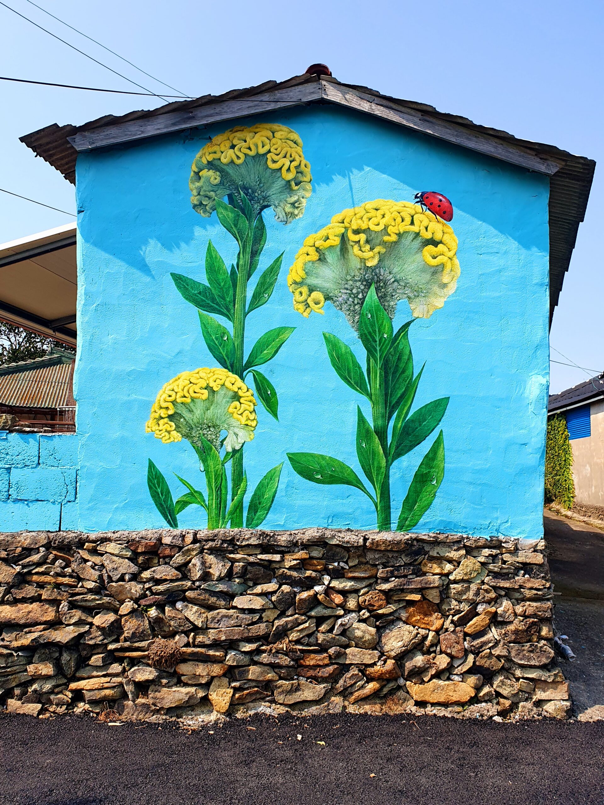 벽화는 맨드라미꽃 특유의 강렬한 색감과 입체적인 형태를 강조해 촬영 시 시선이 자연스럽게 집중되도록 구성되었으며, 방문객이 꽃길을 걷는 듯한 경험을 하며 사진을 남길 수 있도록 동선과 배경을 고려해 배치되었습니다.