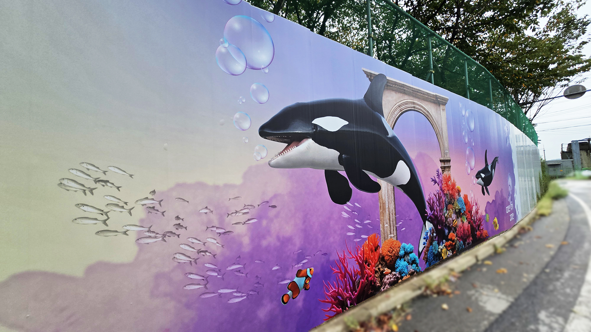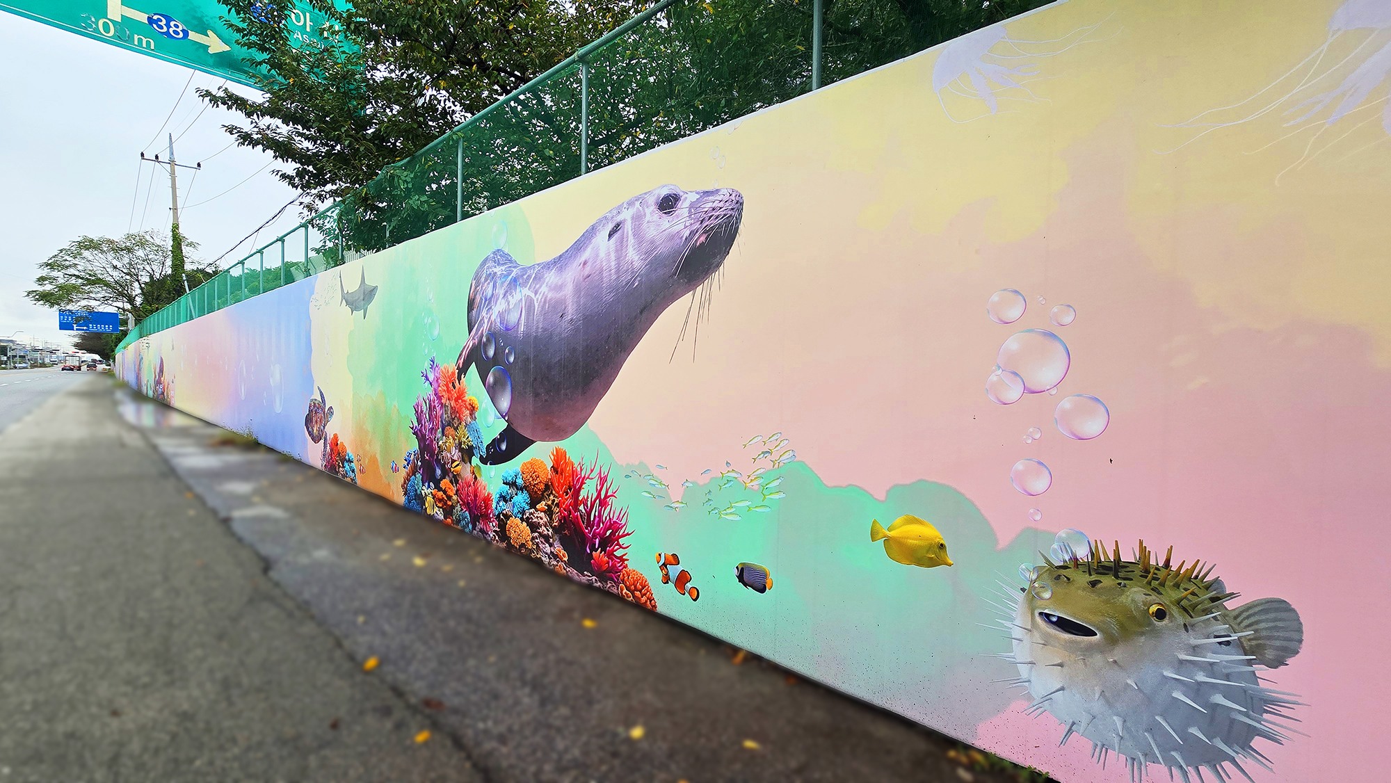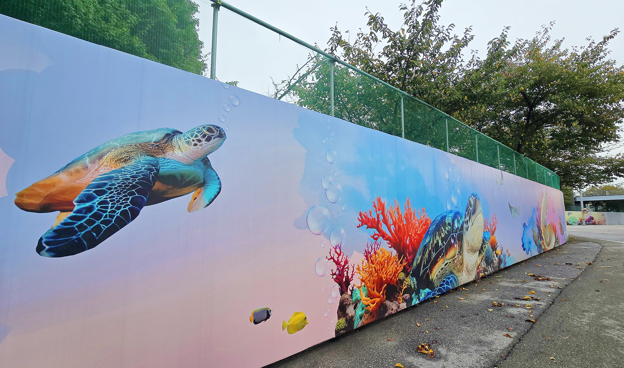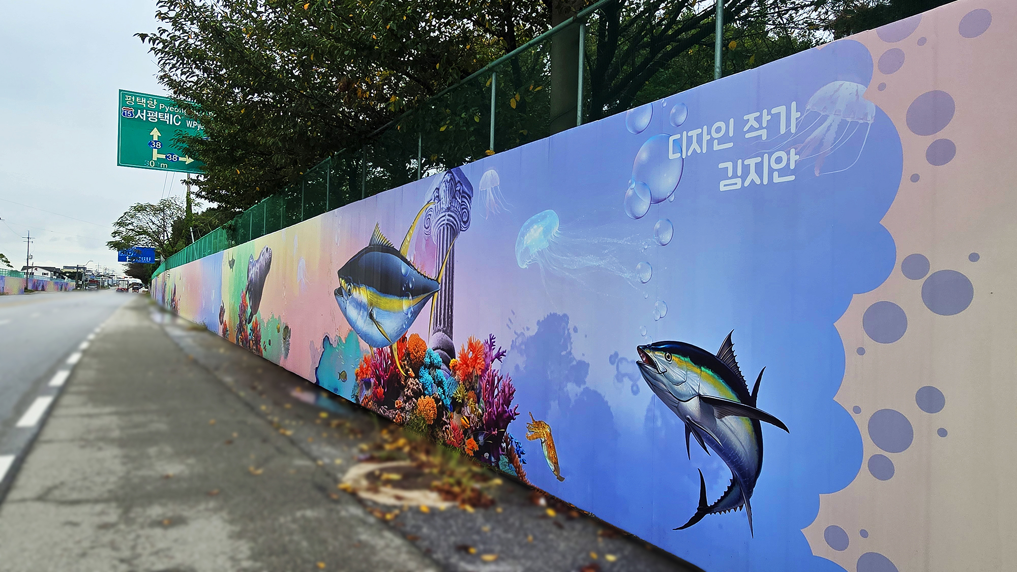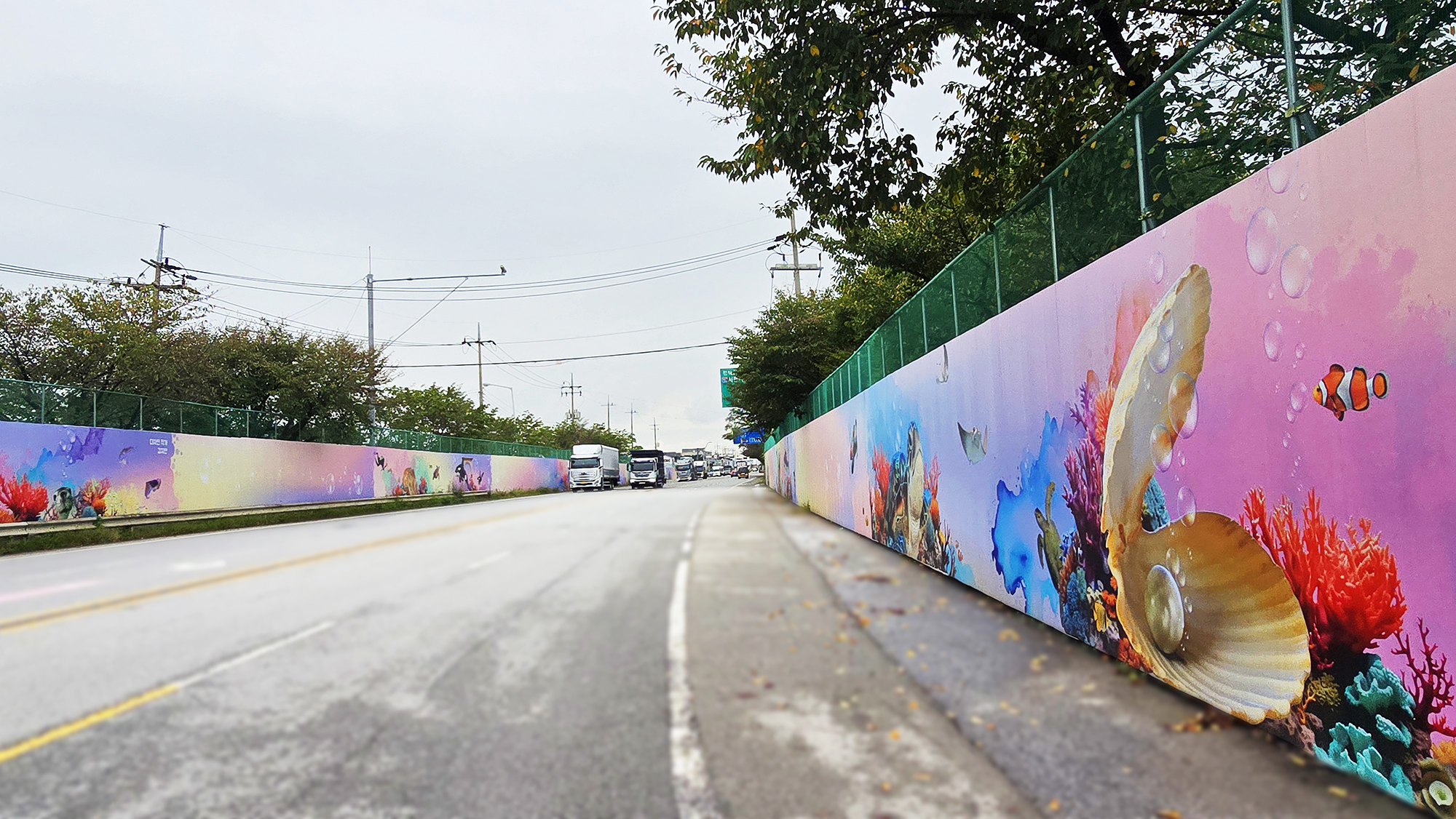 본 작업은 현장 도색 방식 대비 시공 기간을 단축하고 비용을 절감할 수 있는 효율적인 공공디자인 방법으로, 공사 구간에서 발생하는 경관 단절과 시각적 피로감을 완화하는 데 목적을 두었습니다. 또한 평택호 관광단지의 해양생태계 이미지와 지역 홍보 요소를 반영하여, 공사 기간 동안에도 방문객에게 관광 정보를 전달하는 광고형 벽화 콘텐츠로 기능하도록 구성하였습니다.