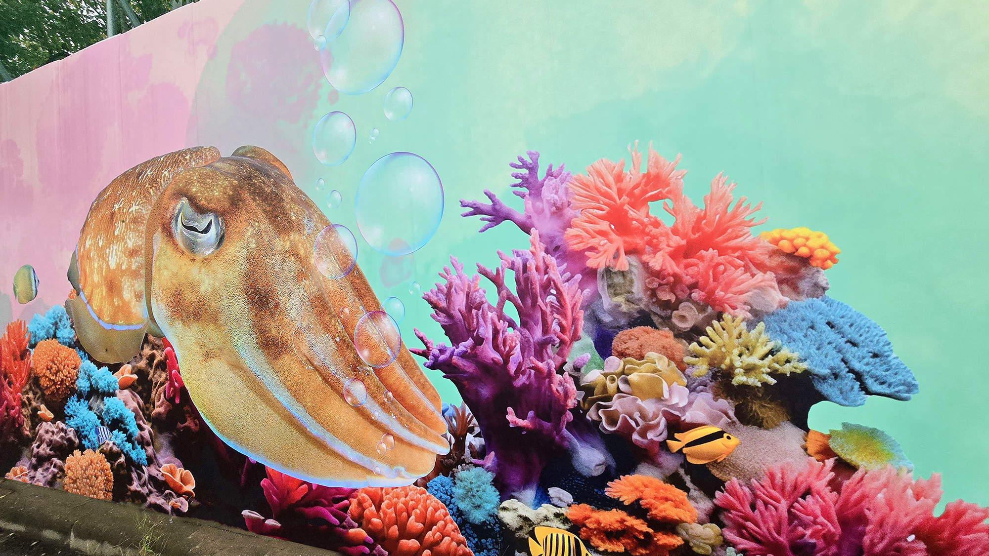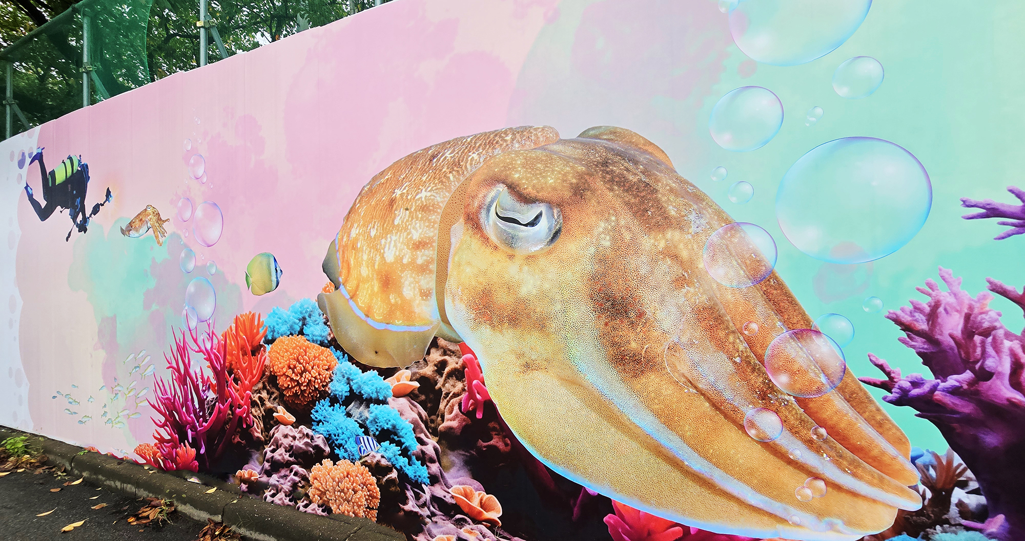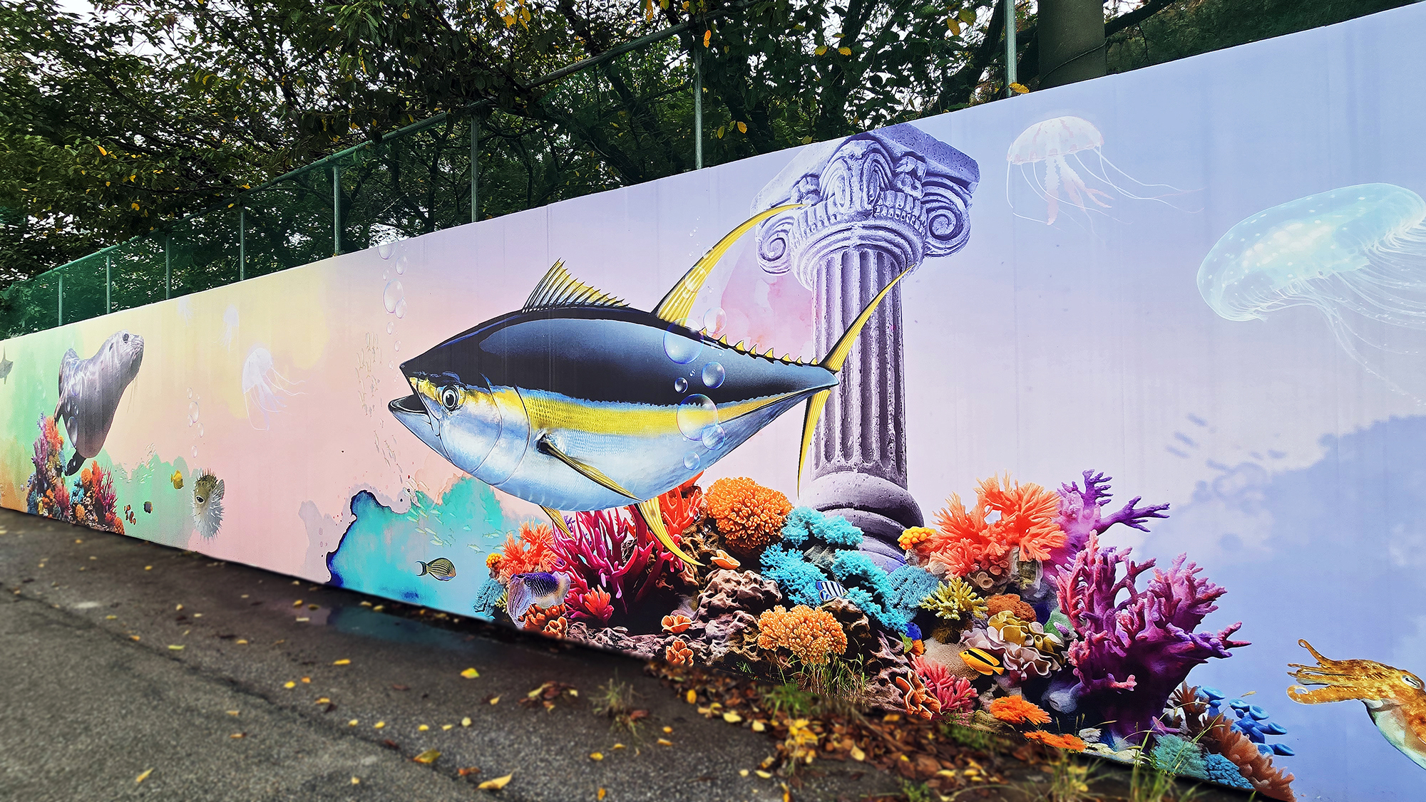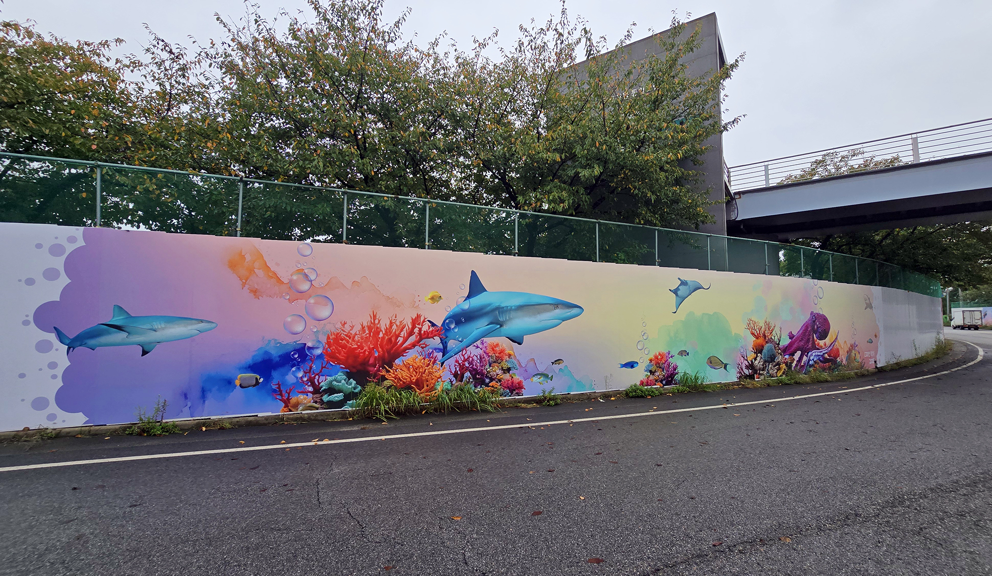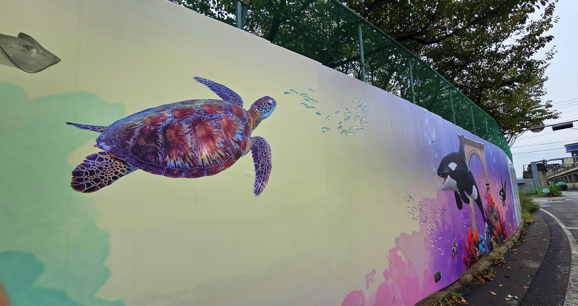 본 작업은 현장 도색 방식 대비 시공 기간을 단축하고 비용을 절감할 수 있는 효율적인 공공디자인 방법으로, 공사 구간에서 발생하는 경관 단절과 시각적 피로감을 완화하는 데 목적을 두었습니다. 또한 평택호 관광단지의 해양생태계 이미지와 지역 홍보 요소를 반영하여, 공사 기간 동안에도 방문객에게 관광 정보를 전달하는 광고형 벽화 콘텐츠로 기능하도록 구성하였습니다.